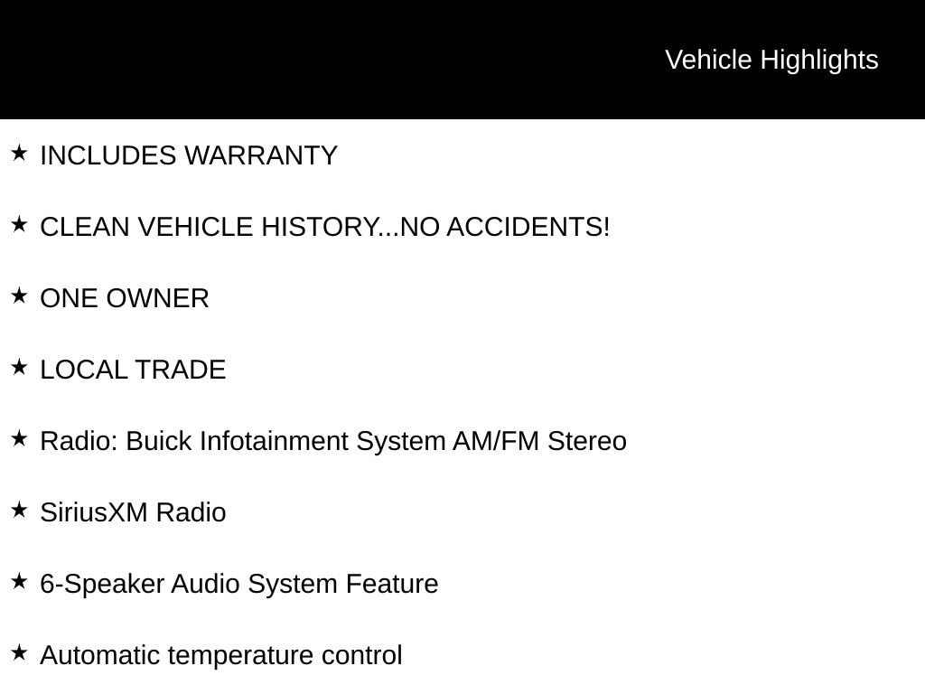 INCLUDES WARRANTY, CLEAN VEHICLE HISTORY...NO ACCIDENTS!, ONE OWNER, LOCAL TRADE, 6-Speaker Audio System Feature, Apple CarPlay/Android Auto, Automatic temperature control, Heated front seats, Perforated Leather-Appointed Seat Trim, Power driver seat, Power Liftgate, Radio: Buick Infotainment System AM/FM Stereo, SiriusXM Radio.
