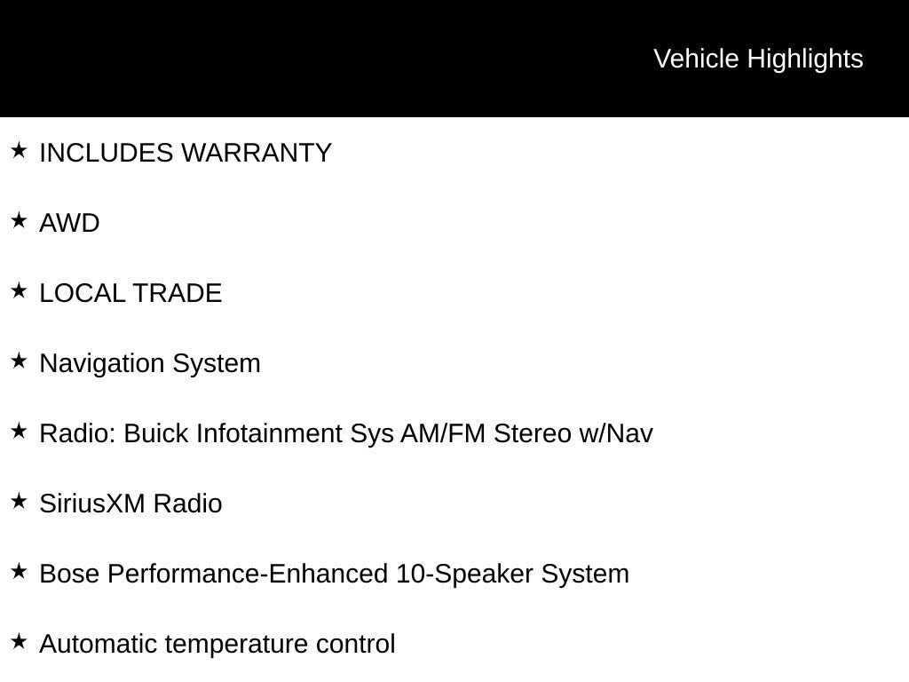 INCLUDES WARRANTY, AWD, LOCAL TRADE, Apple CarPlay/Android Auto, Automatic temperature control, Bose Performance-Enhanced 10-Speaker System, Front Power Sliding Moonroof, Heated Driver & Front Passenger Seats, Navigation System, Perforated Leather-Appointed Seat Trim, Power Liftgate, Radio: Buick Infotainment Sys AM/FM Stereo w/Nav, SiriusXM Radio, Ventilated Driver & Front Passenger Seats, Wheels: 20 Aluminum w/Premium Pearl Nickel Finish, Wireless Charging.