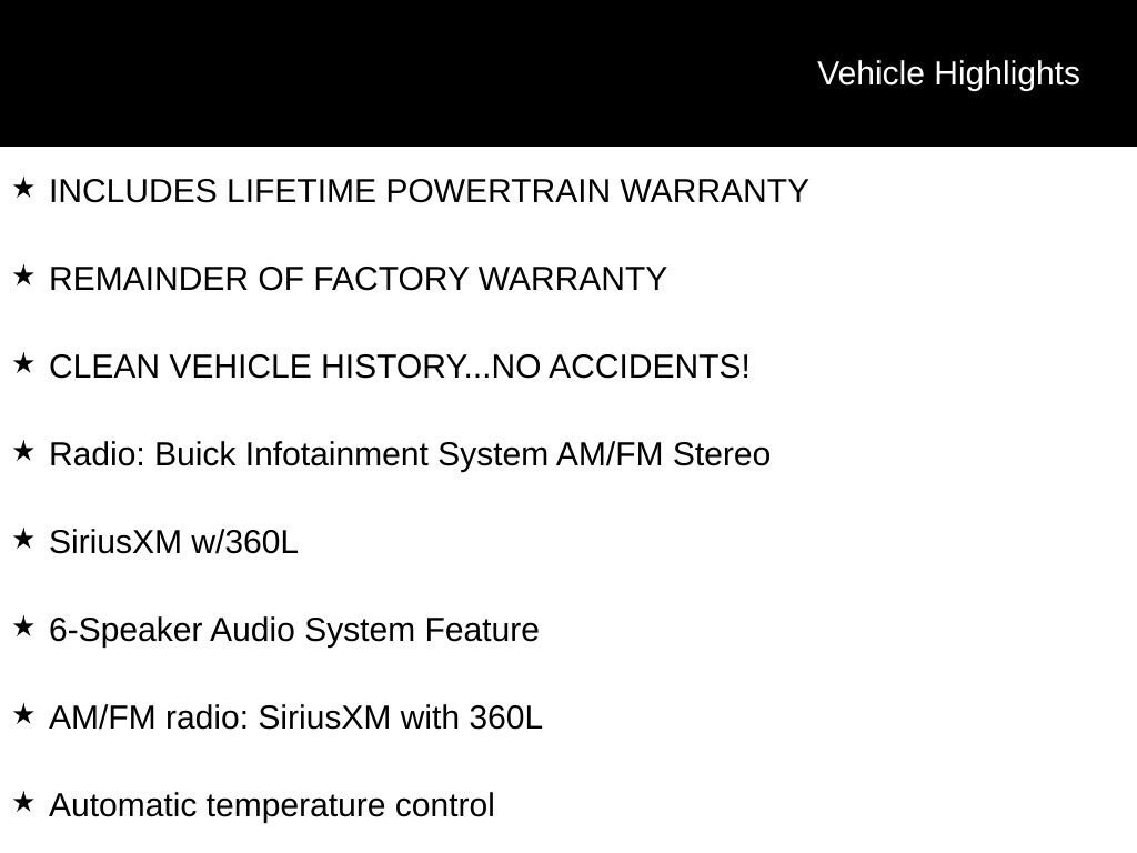 INCLUDES LIFETIME POWERTRAIN WARRANTY, REMAINDER OF FACTORY WARRANTY, CLEAN VEHICLE HISTORY...NO ACCIDENTS!, 18 Aluminum Wheels, 6-Speaker Audio System Feature, 6-Way Power Front Passenger Seat Adjuster, 7-Passenger Seating, 8-Way Power Driver Seat Adjuster, AM/FM radio: SiriusXM with 360L, Automatic temperature control, Front Bucket Seats, Heated Driver & Front Passenger Seats, Heated Steering Wheel, Power Driver Lumbar Control Seat Adjuster, Power Liftgate, Power Passenger Lumbar Control Seat Adjuster, Radio: Buick Infotainment System AM/FM Stereo, SiriusXM w/360L, Wireless Apple CarPlay/Wireless Android Auto.
