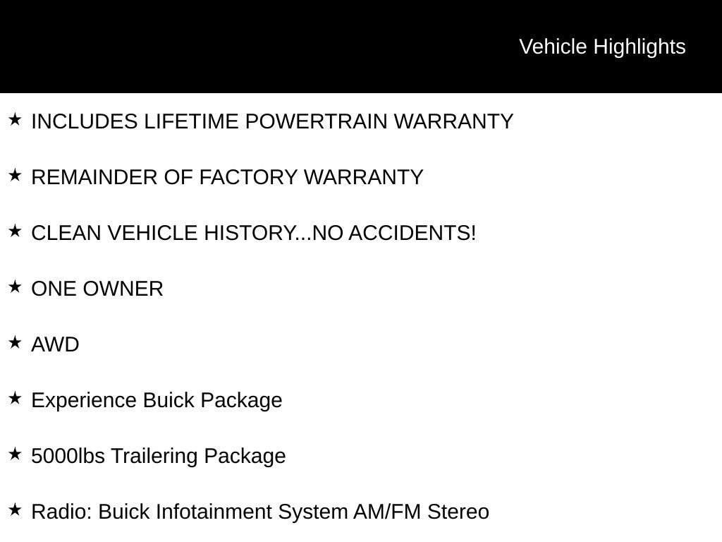 INCLUDES LIFETIME POWERTRAIN WARRANTY, REMAINDER OF FACTORY WARRANTY, CLEAN VEHICLE HISTORY...NO ACCIDENTS!, ONE OWNER, AWD, 5000lbs Trailering Package, 6-Speaker Audio System Feature, 8-Way Power Driver Seat Adjuster, Automatic temperature control, Experience Buick Package, Front Power Sliding Moonroof, Heated Driver & Front Passenger Seats, Heated Steering Wheel, Heavy-Duty Cooling System, Hitch Guidance, Hitch Guidance w/Hitch View, Perforated Leather-Appointed Seat Trim, Power Liftgate, Radio: Buick Infotainment System AM/FM Stereo, SiriusXM w/360L, Wireless Apple CarPlay/Wireless Android Auto.Odometer is 5510 miles below market average!For over 50 years, Tom Ahl has been committed to earning your business, trust and friendship by providing you with the greatest value in a vehicle for the lowest cost to you. We offer full disclosure with every vehicle by providing a complimentary Autocheck vehicle history report and a copy of repairs made following our extensive 72 point inspection. For a deal so good it'll knock your socks off, visit Tom Ahl's today!