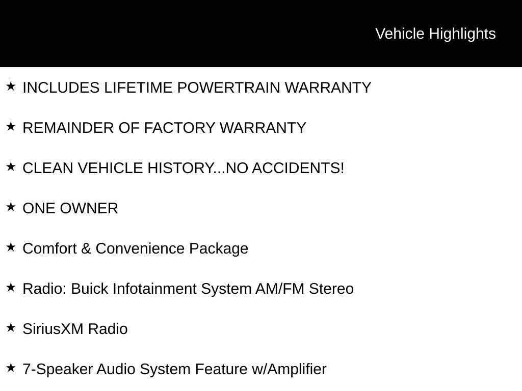 INCLUDES LIFETIME POWERTRAIN WARRANTY, REMAINDER OF FACTORY WARRANTY, CLEAN VEHICLE HISTORY...NO ACCIDENTS!, ONE OWNER, 7-Speaker Audio System Feature w/Amplifier, Air Quality Indicator Sensor, Automatic Air Circulation/Air Quality Sensor, Comfort & Convenience Package, Dual-Zone ACC Air Conditioning, Hands Free Power Programmable Liftgate, Heated Driver & Front Passenger Seats, Heated Steering Wheel, Radio: Buick Infotainment System AM/FM Stereo, Remote Vehicle Starter System, SiriusXM Radio, Wireless Apple CarPlay/Wireless Android Auto.Recent Arrival! 23/31 City/Highway MPGFor over 50 years, Tom Ahl has been committed to earning your business, trust and friendship by providing you with the greatest value in a vehicle for the lowest cost to you. We offer full disclosure with every vehicle by providing a complimentary Autocheck vehicle history report and a copy of repairs made following our extensive 72 point inspection. For a deal so good it'll knock your socks off, visit Tom Ahl's today!