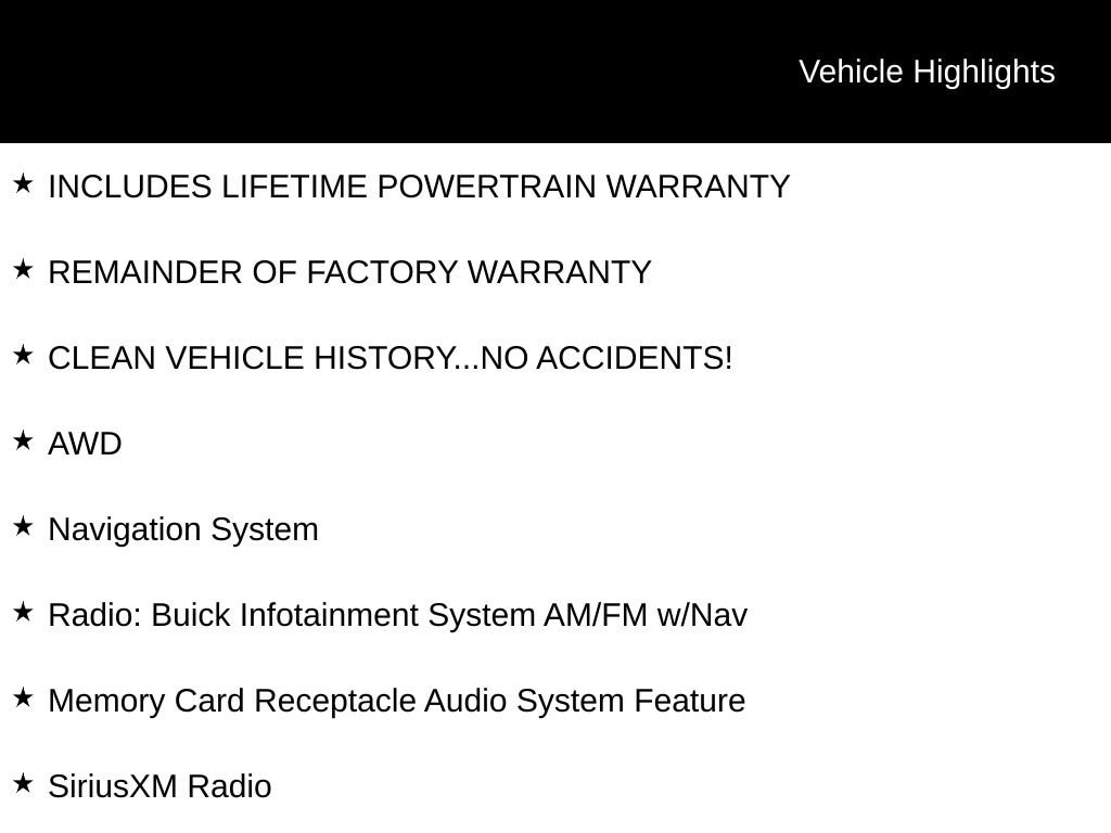 INCLUDES LIFETIME POWERTRAIN WARRANTY, REMAINDER OF FACTORY WARRANTY, CLEAN VEHICLE HISTORY...NO ACCIDENTS!, AWD, 8-Way Power Driver Seat Adjuster, Apple CarPlay/Android Auto, Automatic temperature control, Bose Premium 9-Speaker Audio System Feature, Exterior Parking Camera Rear, HD Radio, Heads-Up Display, Heated Driver & Front Passenger Seats, Heated Rear Outboard Seating Positions, Heated steering wheel, Memory Card Receptacle Audio System Feature, Navigation System, Perforated Leather-Appointed Seat Trim, Power Liftgate, Power moonroof, Radio: Buick Infotainment System AM/FM w/Nav, SiriusXM Radio, Ventilated Driver & Front Passenger Seats, Wheels: 20 Aluminum w/Avenir Pearl Nickel Finish, Wireless Apple CarPlay/Wireless Android Auto.
