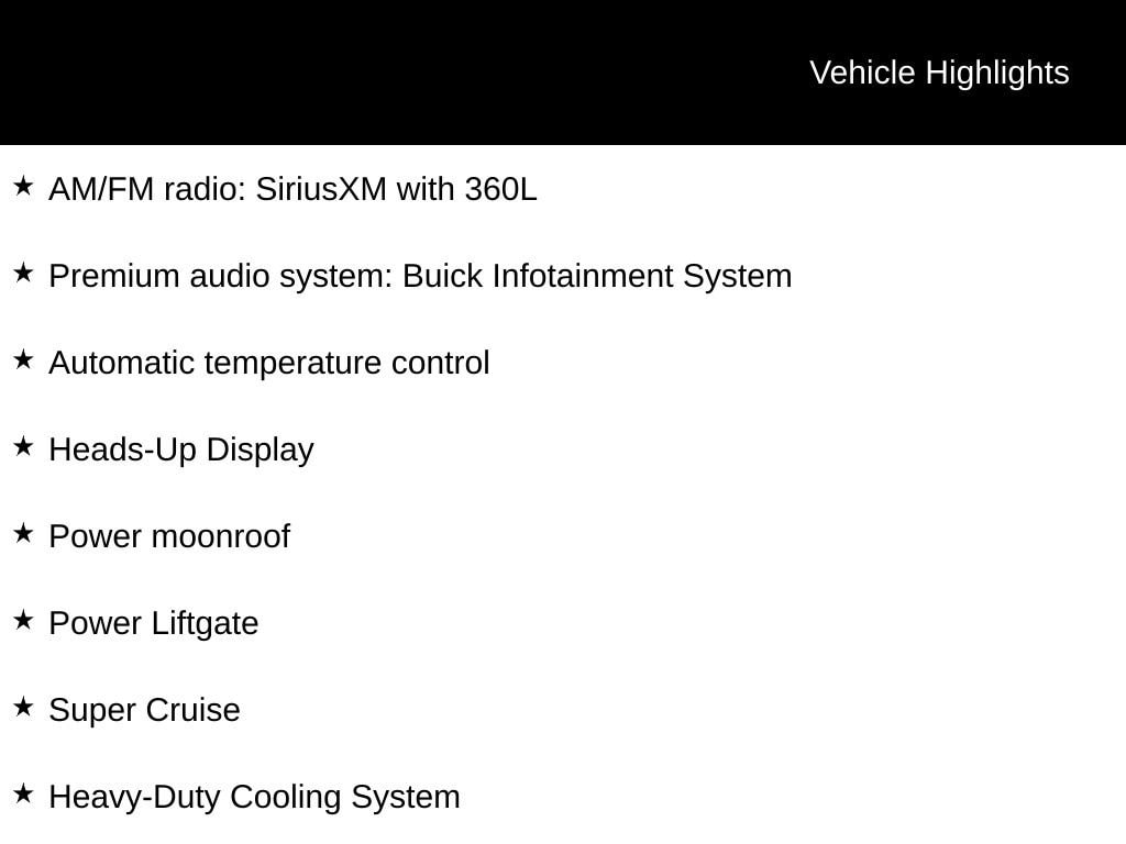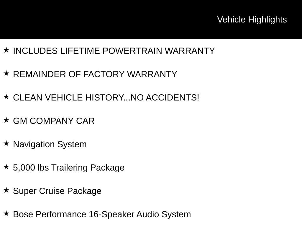 Priced below KBB Fair Purchase Price! INCLUDES LIFETIME POWERTRAIN WARRANTY, REMAINDER OF FACTORY WARRANTY, CLEAN VEHICLE HISTORY...NO ACCIDENTS!, GM COMPANY CAR, 5,000 lbs Trailering Package, AM/FM radio: SiriusXM with 360L, Automatic temperature control, Bose Performance 16-Speaker Audio System, Driver Attention Assist, Driver Massage Control with 4-Way Power Lumbar, Enhanced Automatic Parking Assist, Heads-Up Display, Heated Driver and Front Passenger Seats, Heated rear seats, Heated steering wheel, Heavy-Duty Cooling System, Hitch Guidance, Hitch View with Pan/Zoom/Tilt Image Adjustment, Inside Rearview Auo-Dimming Rear Camera Mirror, Navigation System, Power Liftgate, Power moonroof, Premium audio system: Buick Infotainment System, Quilted and Perforated Leather-Appointed Seat Trim, Super Cruise, Super Cruise Package, Ventilated Driver and Front Passenger Seats, Wheels: 22 Alloy with Avenir Pearl Nickel Finish, Wireless Apple CarPlay, Wireless Google Android Auto.