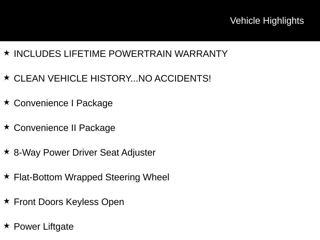 Priced below KBB Fair Purchase Price! INCLUDES LIFETIME POWERTRAIN WARRANTY, CLEAN VEHICLE HISTORY...NO ACCIDENTS!, 2-Way Power Driver Lumbar Control, 8-Way Power Driver Seat Adjuster, Convenience I Package, Convenience II Package, Exterior Parking Camera Rear, Flat-Bottom Wrapped Steering Wheel, Front Doors Keyless Open, Front Intermittent Rainsense Wipers, Heated Driver & Front Passenger Seats, Heated Steering Wheel, Power Liftgate, Rear Parking Sensors, Wireless Charging.