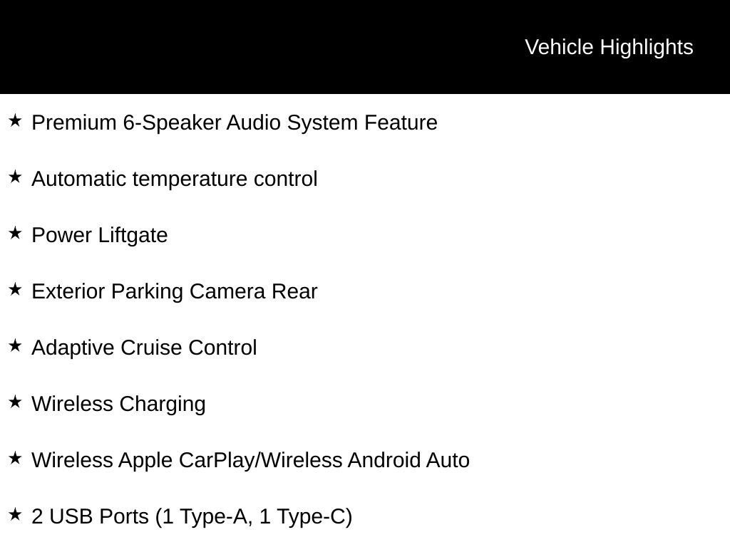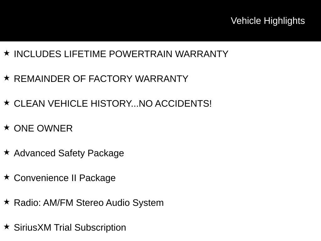 INCLUDES LIFETIME POWERTRAIN WARRANTY, REMAINDER OF FACTORY WARRANTY, CLEAN VEHICLE HISTORY...NO ACCIDENTS!, ONE OWNER, 2 USB Ports (1 Type-A, 1 Type-C), Adaptive Cruise Control, Advanced Safety Package, Automatic temperature control, Convenience II Package, Exterior Parking Camera Rear, Front Intermittent Rainsense Wipers, Lane Change Alert w/Side Blind Zone Alert, Leatherette Seat Trim, Power Liftgate, Premium 6-Speaker Audio System Feature, Radio: AM/FM Stereo Audio System, Rear Cross Traffic Alert, SiriusXM Trial Subscription, Wheels: 18 Black Painted Aluminum, Wireless Apple CarPlay/Wireless Android Auto, Wireless Charging.Recent Arrival! 28/32 City/Highway MPGFor over 50 years, Tom Ahl has been committed to earning your business, trust and friendship by providing you with the greatest value in a vehicle for the lowest cost to you. We offer full disclosure with every vehicle by providing a complimentary Autocheck vehicle history report and a copy of repairs made following our extensive 72 point inspection. For a deal so good it'll knock your socks off, visit Tom Ahl's today!
