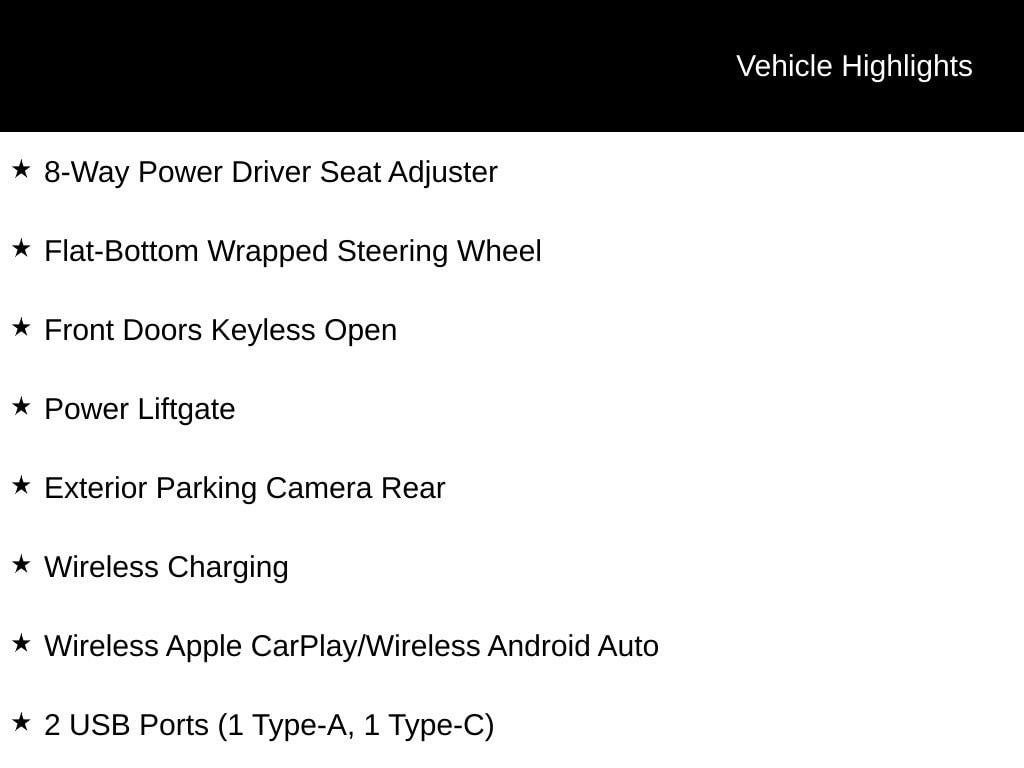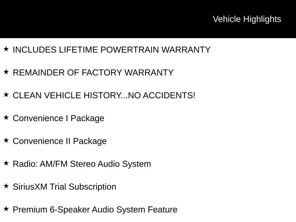 INCLUDES LIFETIME POWERTRAIN WARRANTY, REMAINDER OF FACTORY WARRANTY, CLEAN VEHICLE HISTORY...NO ACCIDENTS!, 2 USB Ports (1 Type-A, 1 Type-C), 2-Way Power Driver Lumbar Control, 8-Way Power Driver Seat Adjuster, Convenience I Package, Convenience II Package, Exterior Parking Camera Rear, Flat-Bottom Wrapped Steering Wheel, Front Doors Keyless Open, Front Intermittent Rainsense Wipers, Heated Driver & Front Passenger Seats, Heated Steering Wheel, Power Liftgate, Premium 6-Speaker Audio System Feature, Radio: AM/FM Stereo Audio System, SiriusXM Trial Subscription, Wireless Apple CarPlay/Wireless Android Auto, Wireless Charging.Recent Arrival! 28/32 City/Highway MPG Odometer is 5164 miles below market average!For over 50 years, Tom Ahl has been committed to earning your business, trust and friendship by providing you with the greatest value in a vehicle for the lowest cost to you. We offer full disclosure with every vehicle by providing a complimentary Autocheck vehicle history report and a copy of repairs made following our extensive 72 point inspection. For a deal so good it'll knock your socks off, visit Tom Ahl's today!