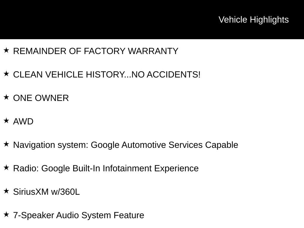 REMAINDER OF FACTORY WARRANTY, CLEAN VEHICLE HISTORY...NO ACCIDENTS!, ONE OWNER, AWD, 7-Speaker Audio System Feature, Apple CarPlay/Android Auto, Automatic temperature control, Front & Rear Park Assist, Heated front seats, Navigation system: Google Automotive Services Capable, Radio: Google Built-In Infotainment Experience, Rear Power Liftgate, SiriusXM w/360L.