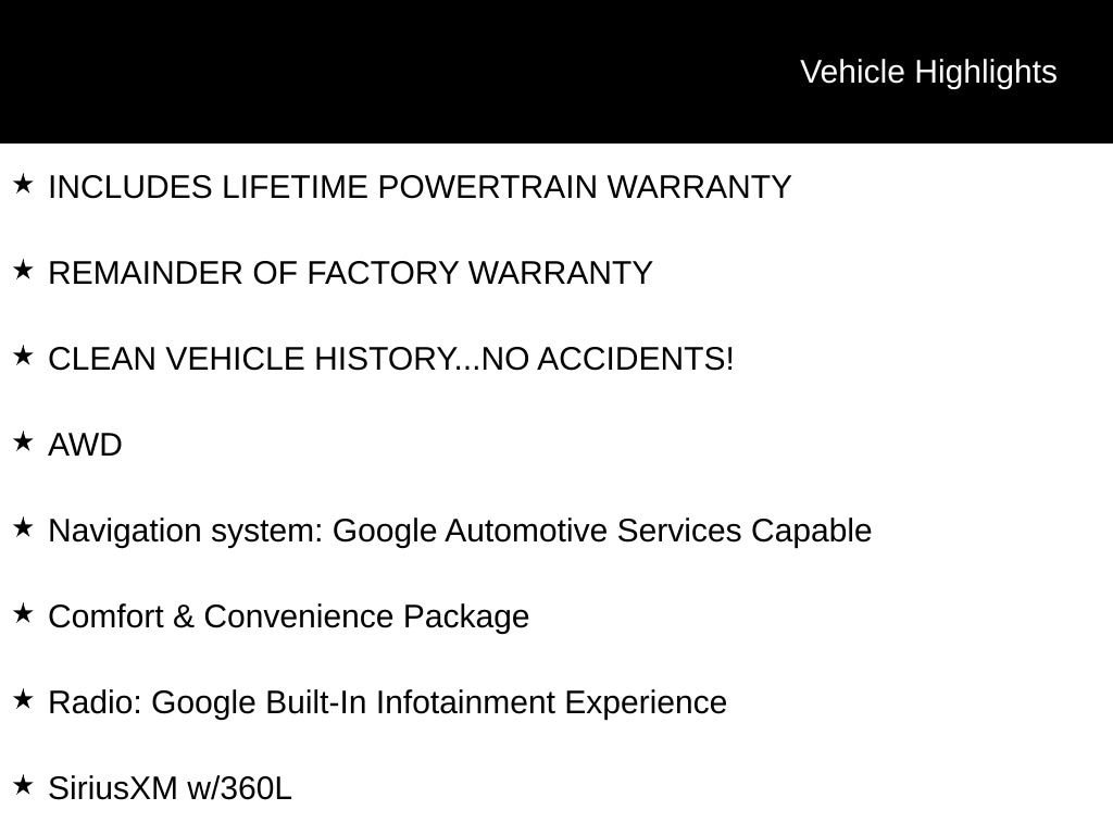 INCLUDES LIFETIME POWERTRAIN WARRANTY, REMAINDER OF FACTORY WARRANTY, CLEAN VEHICLE HISTORY...NO ACCIDENTS!, AWD, 18 Split 5-Spoke Alloy Wheels, 7-Speaker Audio System, 8-Way Power Passenger Seat Adjuster, AM/FM radio: SiriusXM with 360L, Apple CarPlay/Android Auto, Automatic temperature control, Comfort & Convenience Package, Dual Panel Glass Sunroof w/Power Tilt/Sliding, HD Rear Vision Camera, Navigation system: Google Automotive Services Capable, Power Liftgate, Power Lumbar Massage Driver Seat, Power Lumbar Massage Front Passenger Seat, Radio: Google Built-In Infotainment Experience, SiriusXM w/360L, Ventilated Driver & Front Passenger Seats, Wireless Apple CarPlay/Wireless Android Auto.Recent Arrival! 23/28 City/Highway MPGFor over 50 years, Tom Ahl has been committed to earning your business, trust and friendship by providing you with the greatest value in a vehicle for the lowest cost to you. We offer full disclosure with every vehicle by providing a complimentary Autocheck vehicle history report and a copy of repairs made following our extensive 72 point inspection. For a deal so good it'll knock your socks off, visit Tom Ahl's today!