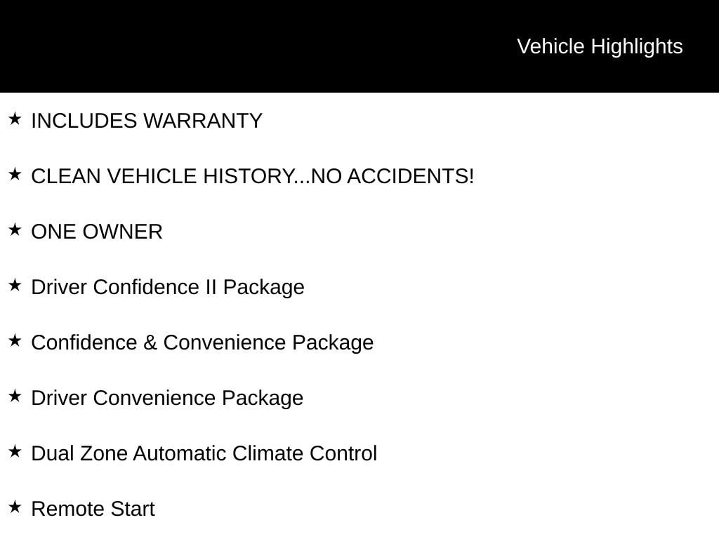 INCLUDES WARRANTY, CLEAN VEHICLE HISTORY...NO ACCIDENTS!, ONE OWNER, 3-Spoke Leather-Wrapped Steering Wheel, Confidence & Convenience Package, Driver Confidence II Package, Driver Convenience Package, Dual Zone Automatic Climate Control, Front Fog Lamps, Heated Driver & Front Passenger Seats, Lane Change Alert w/Side Blind Zone Alert, Rear Cross Traffic Alert, Rear Park Assist w/Audible Warning, Rear Power Liftgate, Remote Start, Universal Home Remote.