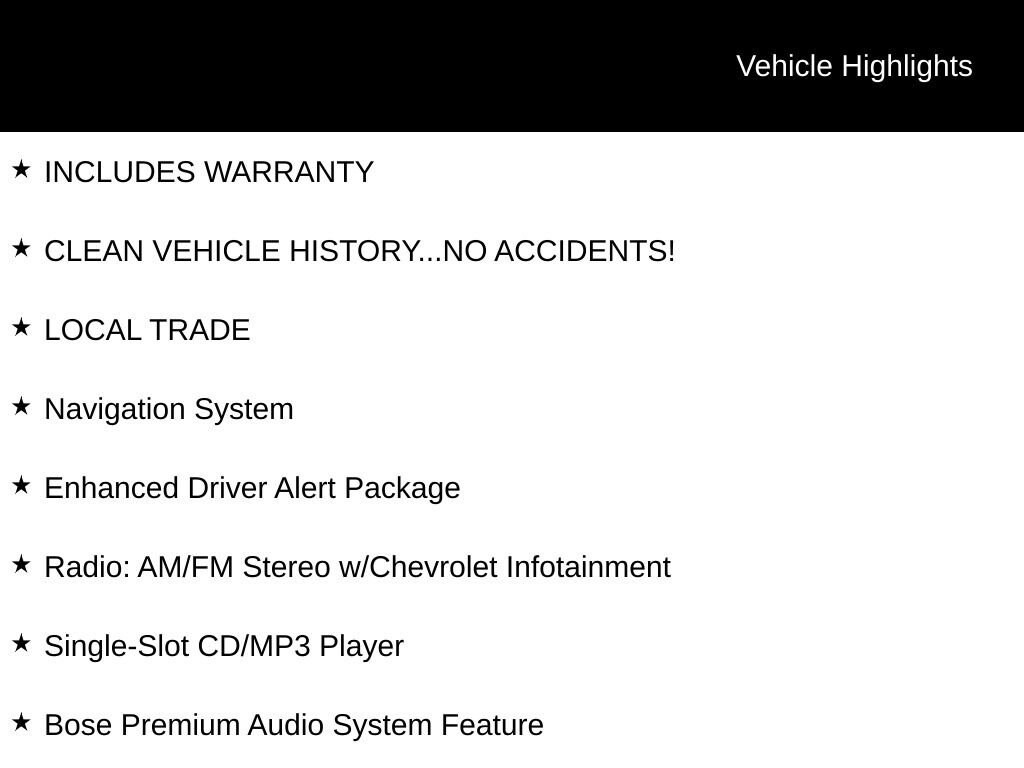 INCLUDES WARRANTY, CLEAN VEHICLE HISTORY...NO ACCIDENTS!, LOCAL TRADE, 4WD, Apple CarPlay/Android Auto, Automatic Emergency Braking, Automatic temperature control, Bose Premium Audio System Feature, Enhanced Driver Alert Package, Exterior Parking Camera Rear, Forward Collision Alert, Heated Front Reclining Bucket Seats, Lane Keep Assist w/Lane Departure Warning, Leather-Appointed Seat Trim, Navigation System, Power Liftgate, Radio: AM/FM Stereo w/Chevrolet Infotainment, Safety Alert Seat, Single-Slot CD/MP3 Player.