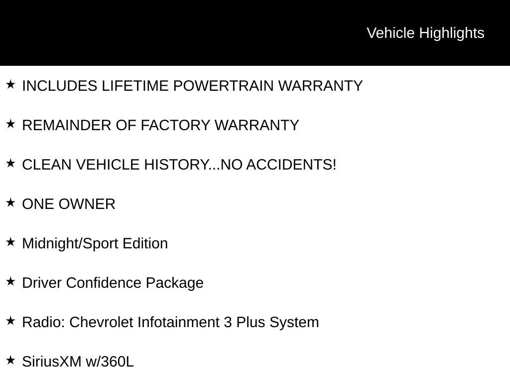 INCLUDES LIFETIME POWERTRAIN WARRANTY, REMAINDER OF FACTORY WARRANTY, CLEAN VEHICLE HISTORY...NO ACCIDENTS!, ONE OWNER, 6-Speaker Audio System Feature, 8-Way Power Driver Seat Adjuster, Automatic temperature control, Black Roof-Mounted Side Rails, Driver Confidence Package, Front & Rear Black Bowties, Lane Change Alert w/Side Blind Zone Alert, Midnight/Sport Edition, Radio: Chevrolet Infotainment 3 Plus System, Rear Cross Traffic Alert, Rear Park Assist w/Audible Warning, SiriusXM w/360L, Wheels: 18 High Gloss Black Painted Aluminum.