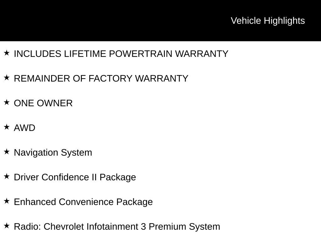 INCLUDES LIFETIME POWERTRAIN WARRANTY, REMAINDER OF FACTORY WARRANTY, ONE OWNER, AWD, Adaptive Cruise Control, Automatic temperature control, Bose Premium 8-Speaker Audio System Feature, Driver Confidence II Package, Enhanced Automatic Emergency Braking, Enhanced Convenience Package, HD Surround Vision, Heated Rear Outboard Seating Positions, Memory Settings For Driver Seat & Exterior Mirrors, Navigation System, Power Tilt & Telescoping Steering Column, Radio: Chevrolet Infotainment 3 Premium System, Rear Camera Mirror, Rear Camera Mirror Washer, Safety Alert Seat, SiriusXM w/360L, Ventilated Driver & Front Passenger Seats.Recent Arrival! 19/26 City/Highway MPG Odometer is 4672 miles below market average!For over 50 years, Tom Ahl has been committed to earning your business, trust and friendship by providing you with the greatest value in a vehicle for the lowest cost to you. We offer full disclosure with every vehicle by providing a complimentary Autocheck vehicle history report and a copy of repairs made following our extensive 72 point inspection. For a deal so good it'll knock your socks off, visit Tom Ahl's today!