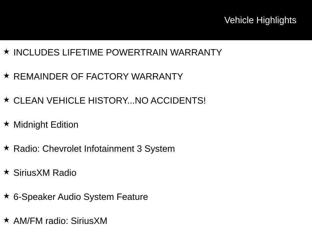 INCLUDES LIFETIME POWERTRAIN WARRANTY, REMAINDER OF FACTORY WARRANTY, CLEAN VEHICLE HISTORY...NO ACCIDENTS!, 6-Speaker Audio System Feature, 8-Way Power Driver Seat Adjuster, AM/FM radio: SiriusXM, Apple CarPlay/Android Auto, Automatic temperature control, Blacked-Out Grille w/Dark Chrome Surround, Exterior Parking Camera Rear, Front & Rear Black Bowties, Midnight Edition, Nameplate Badge In Black, Power Tilt-Sliding Sunroof, Radio: Chevrolet Infotainment 3 System, SiriusXM Radio, Wheels: 19 Black-Painted Aluminum, Wireless Apple CarPlay/Android Auto.Recent Arrival! 27/35 City/Highway MPG Odometer is 4338 miles below market average!For over 50 years, Tom Ahl has been committed to earning your business, trust and friendship by providing you with the greatest value in a vehicle for the lowest cost to you. We offer full disclosure with every vehicle by providing a complimentary Autocheck vehicle history report and a copy of repairs made following our extensive 72 point inspection. For a deal so good it'll knock your socks off, visit Tom Ahl's today!