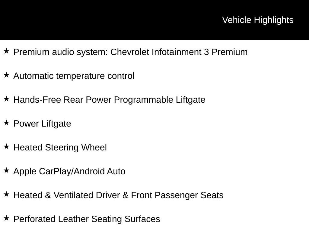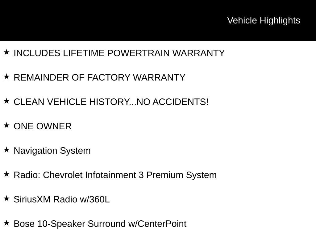 INCLUDES LIFETIME POWERTRAIN WARRANTY, REMAINDER OF FACTORY WARRANTY, CLEAN VEHICLE HISTORY...NO ACCIDENTS!, ONE OWNER, 4WD, 20 x 9 Polished Aluminum Wheels, Apple CarPlay/Android Auto, Automatic temperature control, Bose 10-Speaker Surround w/CenterPoint, Hands-Free Rear Power Programmable Liftgate, Heated & Ventilated Driver & Front Passenger Seats, Heated rear seats, Heated Steering Wheel, Navigation System, Perforated Leather Seating Surfaces, Power Liftgate, Premium audio system: Chevrolet Infotainment 3 Premium, Radio: Chevrolet Infotainment 3 Premium System, SiriusXM Radio w/360L.Recent Arrival! Odometer is 6651 miles below market average!For over 50 years, Tom Ahl has been committed to earning your business, trust and friendship by providing you with the greatest value in a vehicle for the lowest cost to you. We offer full disclosure with every vehicle by providing a complimentary Autocheck vehicle history report and a copy of repairs made following our extensive 72 point inspection. For a deal so good it'll knock your socks off, visit Tom Ahl's today!