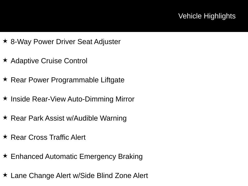 INCLUDES LIFETIME POWERTRAIN WARRANTY, REMAINDER OF FACTORY WARRANTY, CLEAN VEHICLE HISTORY...NO ACCIDENTS!, 8-Way Power Driver Seat Adjuster, Adaptive Cruise Control, AM/FM radio: SiriusXM with 360L, Apple CarPlay/Android Auto, Automatic temperature control, Black Roof-Mounted Side Rails, Convenience Package, Driver Confidence Package, Enhanced Automatic Emergency Braking, Heated Driver & Front Passenger Seats, Inside Rear-View Auto-Dimming Mirror, Lane Change Alert w/Side Blind Zone Alert, Rear Cross Traffic Alert, Rear Park Assist w/Audible Warning, Rear Power Programmable Liftgate, SiriusXM w/360L.Recent Arrival! 22/29 City/Highway MPGFor over 50 years, Tom Ahl has been committed to earning your business, trust and friendship by providing you with the greatest value in a vehicle for the lowest cost to you. We offer full disclosure with every vehicle by providing a complimentary Autocheck vehicle history report and a copy of repairs made following our extensive 72 point inspection. For a deal so good it'll knock your socks off, visit Tom Ahl's today!