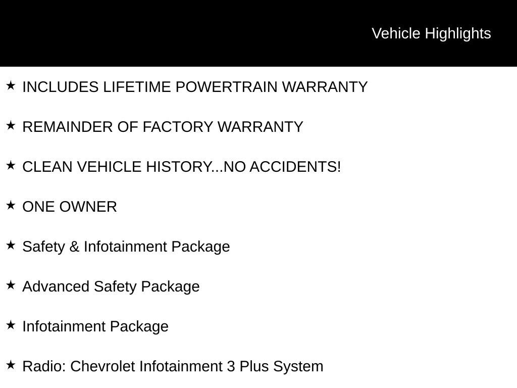 INCLUDES LIFETIME POWERTRAIN WARRANTY, REMAINDER OF FACTORY WARRANTY, CLEAN VEHICLE HISTORY...NO ACCIDENTS!, ONE OWNER, 120-Volt Power Outlet, 2 Rear USB Charging-Only Ports, 2 USB Data Ports, 2 USB Data Ports w/SD Card Reader, Adaptive Cruise Control, Advanced Safety Package, Bluetooth® For Phone, HD Surround Vision, Heated Steering Wheel, Infotainment Package, Outside Heated Power-Adjustable Mirrors, Radio: Chevrolet Infotainment 3 Plus System, Safety & Infotainment Package, SiriusXM.Recent Arrival! 26/31 City/Highway MPG Odometer is 14045 miles below market average!For over 50 years, Tom Ahl has been committed to earning your business, trust and friendship by providing you with the greatest value in a vehicle for the lowest cost to you. We offer full disclosure with every vehicle by providing a complimentary Autocheck vehicle history report and a copy of repairs made following our extensive 72 point inspection. For a deal so good it'll knock your socks off, visit Tom Ahl's today!