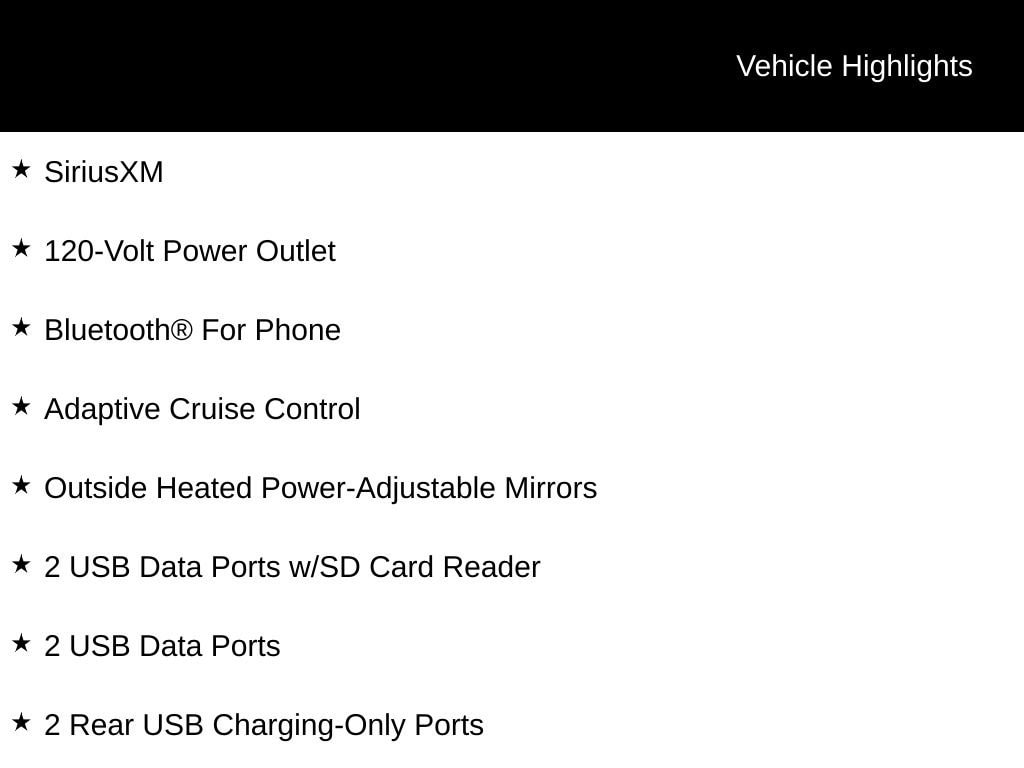 - 2 USB data ports2 with SD Card Reader and auxiliary input jack, located within front center storage bin