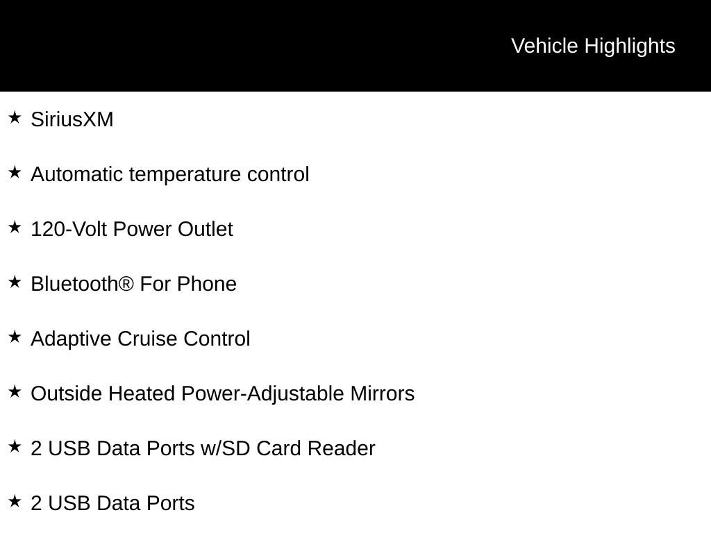 - 2 USB data ports2 with SD Card Reader and auxiliary input jack, located within front center storage bin