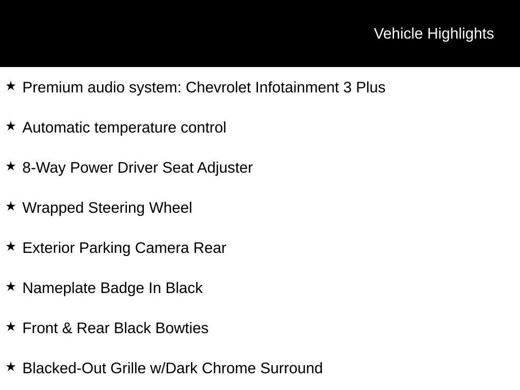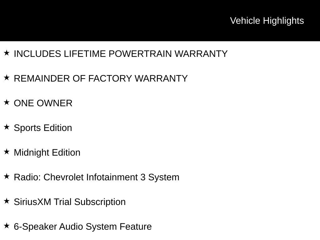 INCLUDES LIFETIME POWERTRAIN WARRANTY, REMAINDER OF FACTORY WARRANTY, ONE OWNER, 6-Speaker Audio System Feature, 8-Way Power Driver Seat Adjuster, Automatic temperature control, Blacked-Out Grille w/Dark Chrome Surround, Exterior Parking Camera Rear, Front & Rear Black Bowties, Heated Driver & Front Passenger Seats, Leather-Wrapped Shift Knob, Midnight Edition, Nameplate Badge In Black, Premium audio system: Chevrolet Infotainment 3 Plus, Radio: Chevrolet Infotainment 3 System, SiriusXM Trial Subscription, Sports Edition, Wheels: 19 Black-Painted Aluminum, Wireless Apple CarPlay/Android Auto, Wrapped Steering Wheel.Recent Arrival! 28/36 City/Highway MPG Odometer is 15002 miles below market average!For over 50 years, Tom Ahl has been committed to earning your business, trust and friendship by providing you with the greatest value in a vehicle for the lowest cost to you. We offer full disclosure with every vehicle by providing a complimentary Autocheck vehicle history report and a copy of repairs made following our extensive 72 point inspection. For a deal so good it'll knock your socks off, visit Tom Ahl's today!