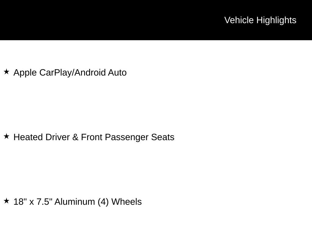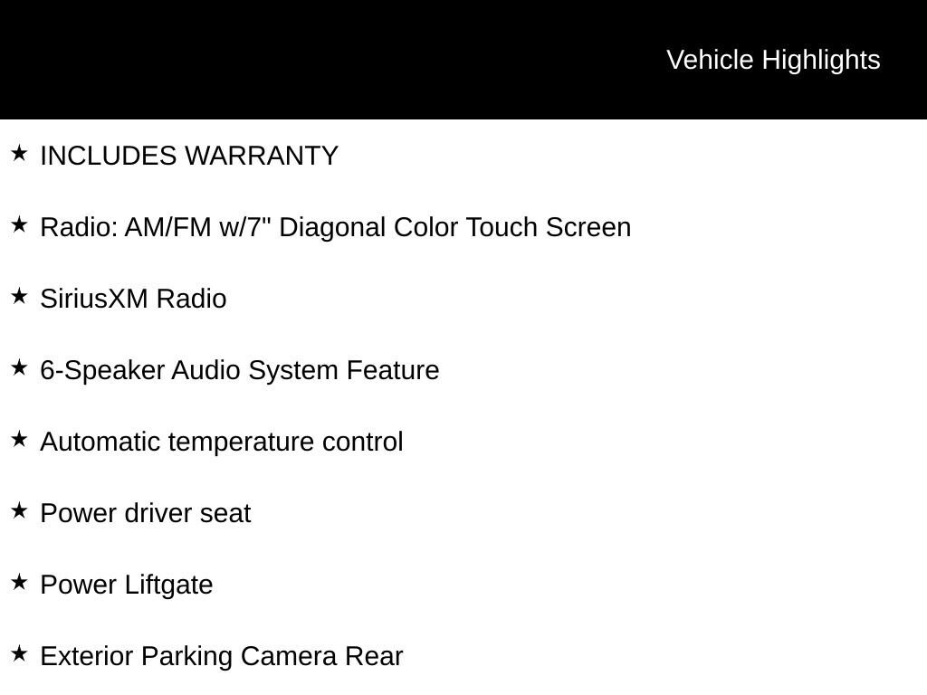 INCLUDES WARRANTY, 18 x 7.5 Aluminum (4) Wheels, 6-Speaker Audio System Feature, Apple CarPlay/Android Auto, Automatic temperature control, Exterior Parking Camera Rear, Heated Driver & Front Passenger Seats, Power driver seat, Power Liftgate, Radio: AM/FM w/7 Diagonal Color Touch Screen, SiriusXM Radio.