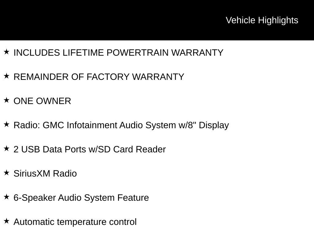INCLUDES LIFETIME POWERTRAIN WARRANTY, REMAINDER OF FACTORY WARRANTY, ONE OWNER, 2 USB Data Ports w/SD Card Reader, 6-Speaker Audio System Feature, 8-Way Power Driver Seat Adjuster, Automatic temperature control, Bluetooth® For Phone, Heated steering wheel, Power Driver Lumbar Control, Power Liftgate, Radio: GMC Infotainment Audio System w/8 Display, SiriusXM Radio, Skyscape Power Sunroof w/Power Sunscreen, Wheels: 18 x 7 Silver Painted Aluminum, Wireless Apple CarPlay/Wireless Android Auto.Recent Arrival! 25/30 City/Highway MPGFor over 50 years, Tom Ahl has been committed to earning your business, trust and friendship by providing you with the greatest value in a vehicle for the lowest cost to you. We offer full disclosure with every vehicle by providing a complimentary Autocheck vehicle history report and a copy of repairs made following our extensive 72 point inspection. For a deal so good it'll knock your socks off, visit Tom Ahl's today!