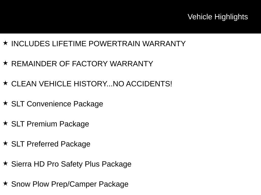 INCLUDES LIFETIME POWERTRAIN WARRANTY, REMAINDER OF FACTORY WARRANTY, CLEAN VEHICLE HISTORY...NO ACCIDENTS!, 4D Crew Cab, Duramax 6.6L V8 Turbodiesel, 4WD, 2 Charge/Data USB Ports Inside Center Console, 220-Amp Alternator, 6 Rectangular Chromed Tubular Assist Steps, Adaptive Cruise Control, Bed View Camera w/2 Trailer Camera Provisions, Bose Premium 7-Speaker Sound System, Floor-Mounted Center Console, Front Bucket Seats, HD Rear Vision Camera Delete, HD Surround Vision, Heated 2nd Row Outboard Seats, LED Smoked Amber Roof Marker Lamps, Power Sliding Rear Window w/Defogger, Rear Cross Traffic Alert, Safety Alert Seat, Sierra HD Pro Safety Plus Package, SLT Convenience Package, SLT Preferred Package, SLT Premium Package, Snow Plow Prep/Camper Package, Spray-On Bedliner, Trailer Cam Provisions & Trailer Viewing Software, Trailer Side Blind Zone Alert, Ultrasonic Front & Rear Park Assist, Universal Home Remote, Ventilated Driver & Front Passenger Seats, Wireless Charging.