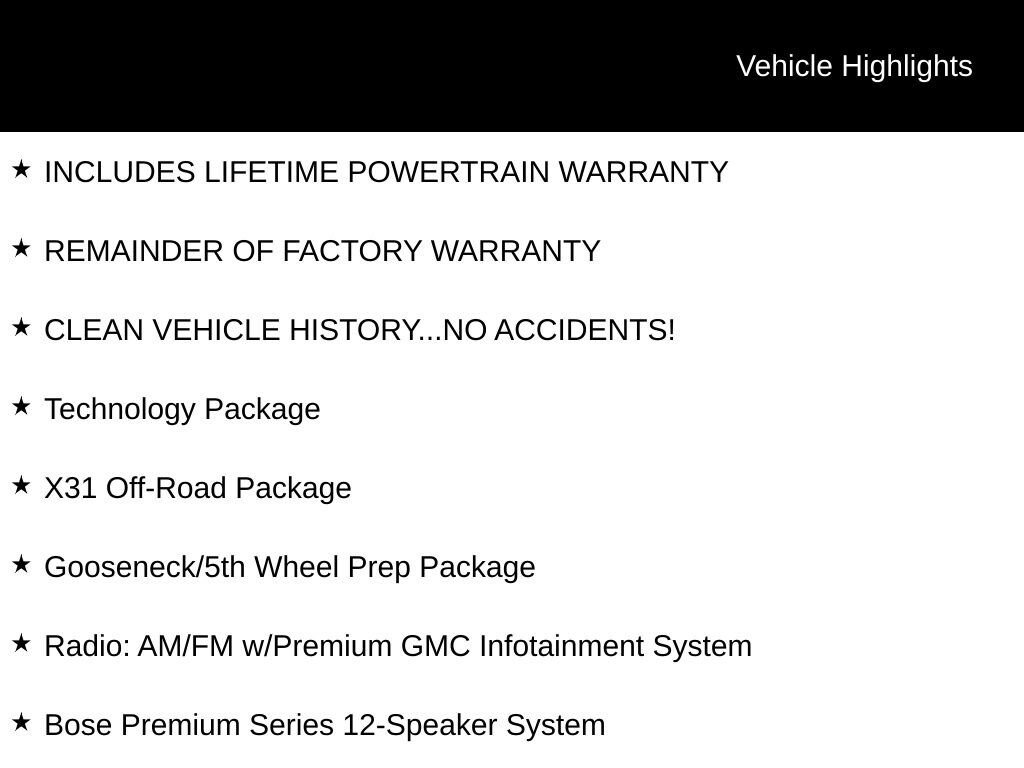 INCLUDES LIFETIME POWERTRAIN WARRANTY, REMAINDER OF FACTORY WARRANTY, CLEAN VEHICLE HISTORY...NO ACCIDENTS!, 4D Crew Cab, Duramax 6.6L V8 Turbodiesel, 4WD, Bose Premium Series 12-Speaker System, Gooseneck/5th Wheel Prep Package, Heated Driver & Front Outboard Passenger Seats, Inside Rearview Auto-Dimming Rear Camera Mirror, Lane Departure Warning System, Multicolor 15 Diagonal Head-Up Display, Power moonroof, Radio: AM/FM w/Premium GMC Infotainment System, Technology Package, Ventilated Driver & Front Passenger Seats, X31 Off-Road Package.